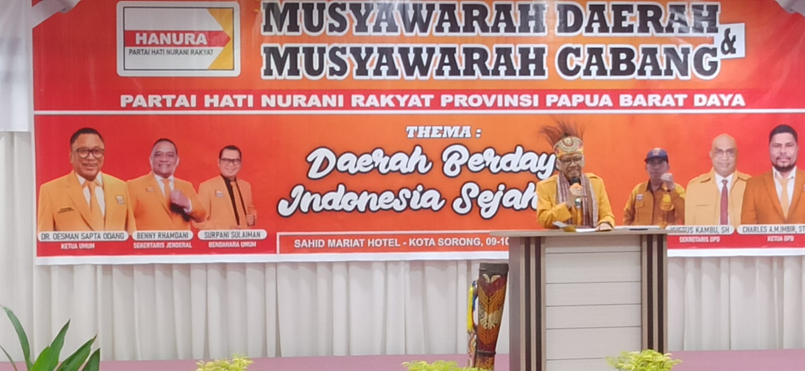 KOTA SORONG PBD, BUSERJATIM.COM GROUP – Partai Hanura Papua Barat Daya (PBD) menggelar Musyawarah Daerah (Musda) dan Musyawarah Cabang (Muscab) di Kota Sorong pada Sabtu, 9 Oktober 2025, bertempat di Hotel Sahit Mariat, Jalan Ahmad Yani, Kelurahan Klademak. Dengan mengusung tema “Daerah Berdaya, Indonesia Sejahtera,” kegiatan ini bertujuan menyelaraskan visi dan misi partai sekaligus merancang strategi kemenangan di daerah.