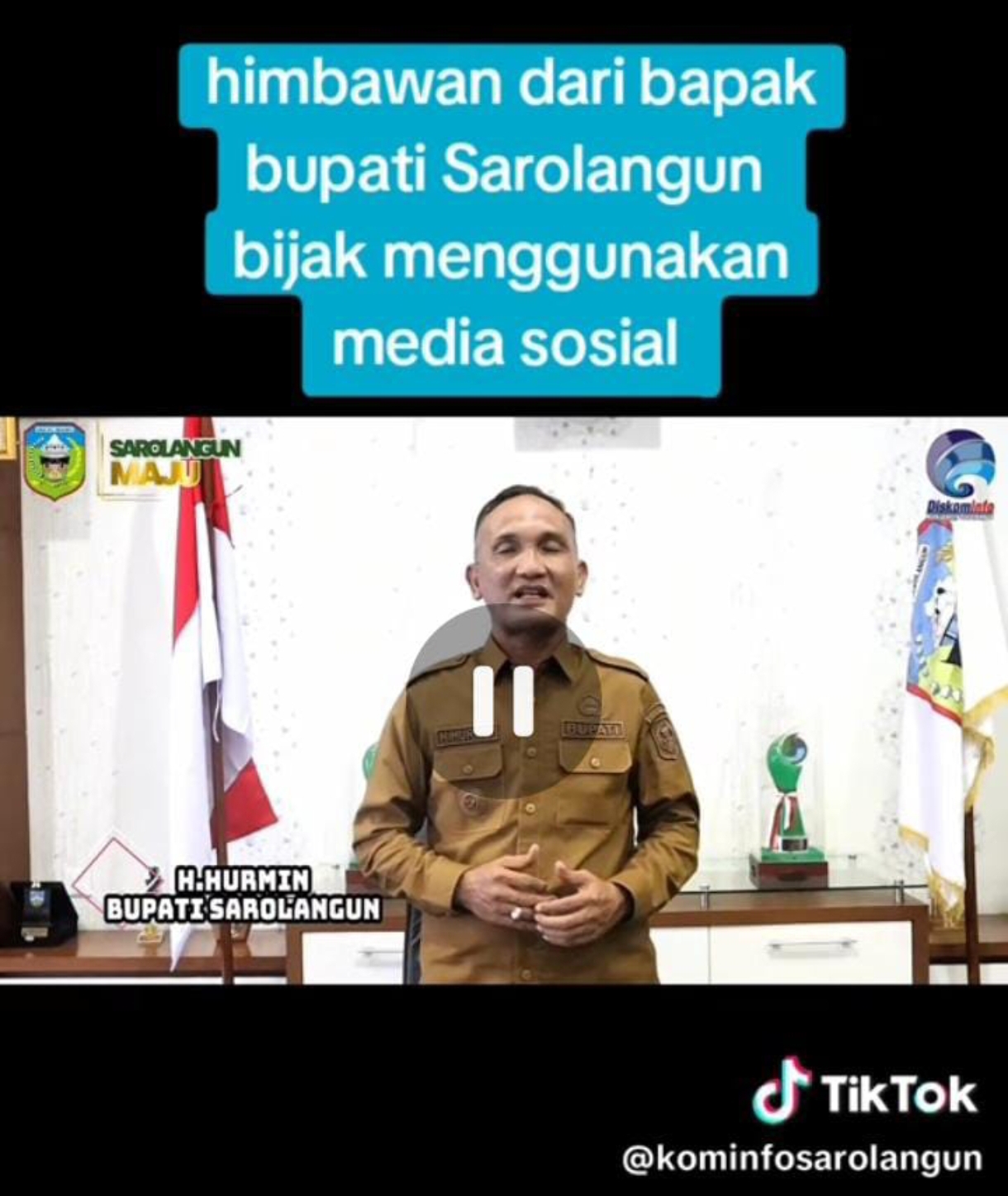 Ia juga menyoroti penggunaan akun resmi pemerintah dan lambang Dinas Kominfo Sarolangun dalam video tersebut tanpa kejelasan dasar hukum yang mengatur penyampaian informasi publik melalui platform komersial seperti TikTok.