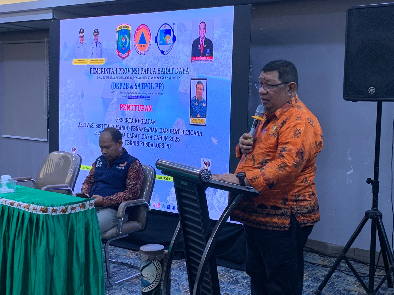 SORONG PBD, BUSERJATIM.COM GROUP — Kepala Dinas DKP2B sekaligus Kasatpol PP Papua Barat Daya, Vicente Campana Baay, S.IP, mewakili Gubernur Papua Barat Daya Elisa Kambu, S.Sos, resmi menutup Bimbingan Teknis (Bimtek) Pusdalops Penanggulangan Bencana terkait aktivasi Sistem Komando Penanganan Darurat Bencana Tahun 2025. Kegiatan tersebut berlangsung di Hotel Rilys Panorama, Jalan Sam Ratulangi, Kelurahan Kampung Baru, Distrik Sorong Kota, pada Kamis (04/12/25).