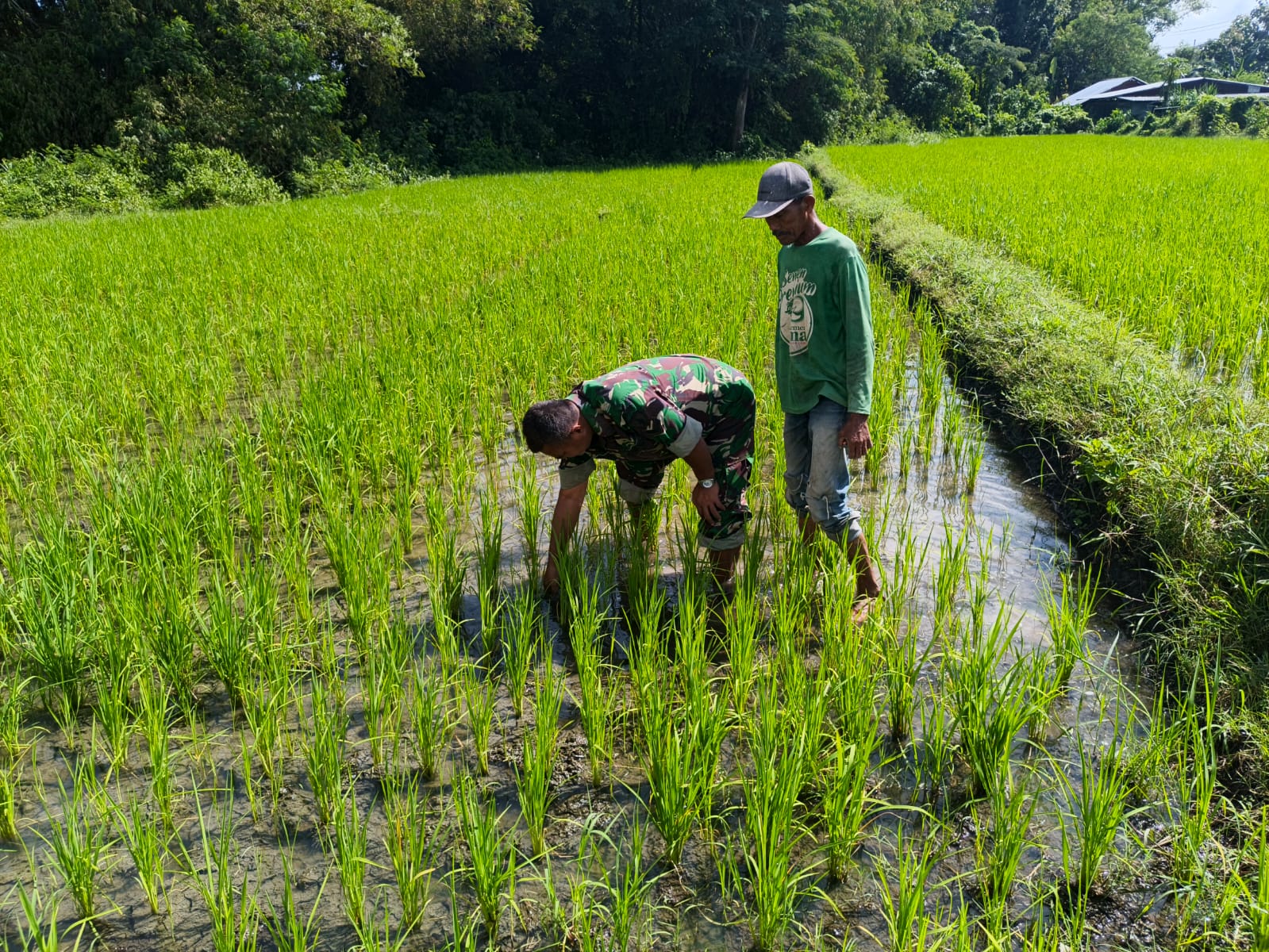 Mulai dari penyiapan lahan, penyemaian benih, penanaman, perawatan hingga panen bahkan saat menjual hasil pertanian semua tak lepas dari monitoring atau pendampingan. Seperti hari ini saat warga / petani melakukan perawatan berupa penyiangan rumput atau hama tanaman padi juga tak luput dari pendampingan dan pengawalan Sertu Sedarwanto.