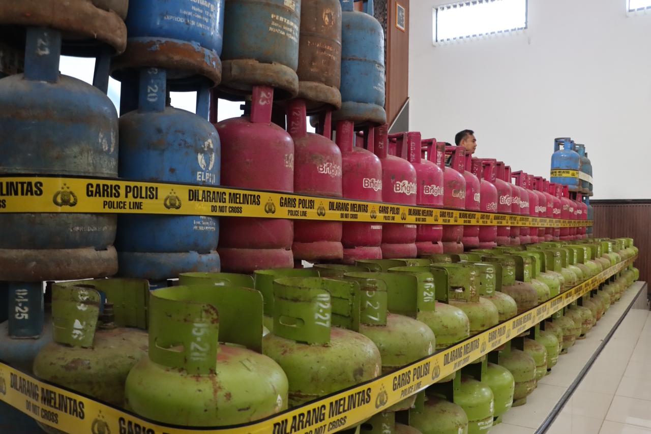 Barang bukti yang disita meliputi satu unit mobil Suzuki Carry pick-up hitam, 132 tabung gas 3 kg kosong, 54 tabung 12 kg kosong, 53 tabung 12 kg hasil pengoplosan, serta peralatan modifikasi seperti selang dan segel palsu.