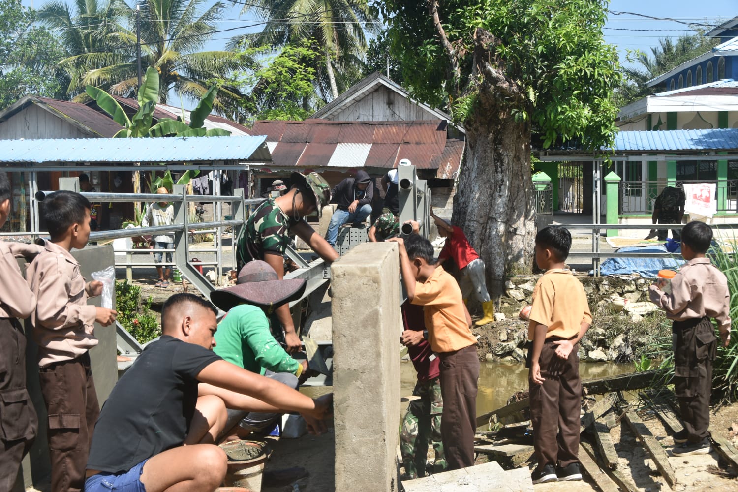 Terlihat di lapangan, anggota TNI bersama masyarakat bahu-membahu menyelesaikan pekerjaan konstruksi, mulai dari pemasangan rangka hingga pengecoran bagian penyangga jembatan. Semangat gotong royong menjadi kunci utama dalam percepatan pembangunan infrastruktur tersebut.
